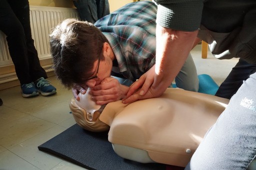 Und weiter ging es zur Reanimation mit der Herzdruckmassage und Beatmung. Wenn einem vorher noch kalt oder er etwas müde war, so waren danach alle wach. Und trotz des ernsten Themas, hatte wir Spaß, vor allem, weil alle merkten: so schwer ist es nicht und ich kann es.