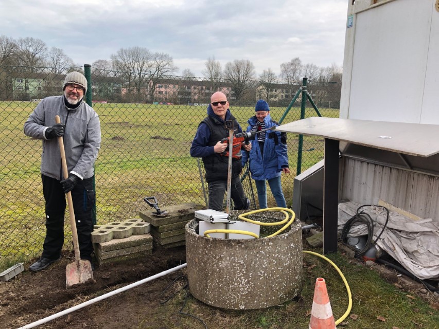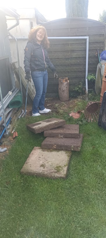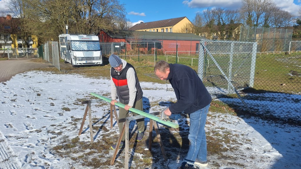 12.10.2024: Kai transportierte 17 schwere Gehwegplatten von Petra G. aufs Gelände. Uwe und Volker halfen dabei, die Platten aus dem Garten zu heben. Parallel dazu wurde ein Baukostenzuschuss beim Hamburger Sportbund beantragt, und ein Investitionsplan wurde erstellt.