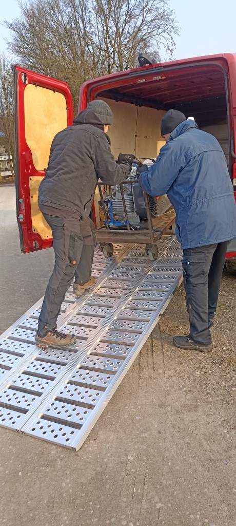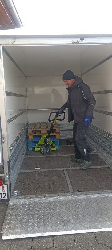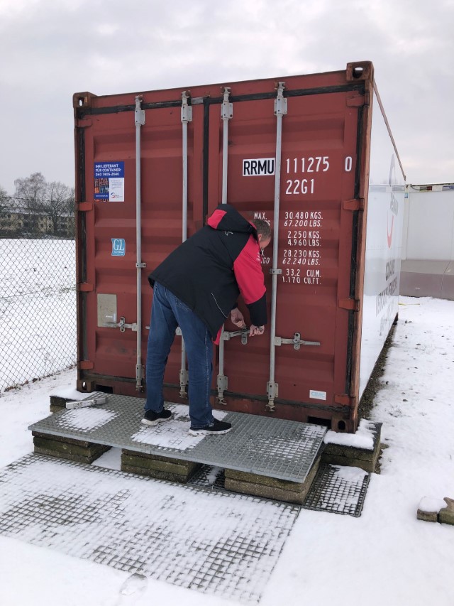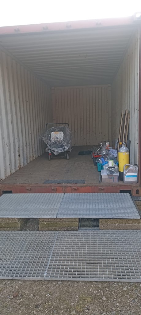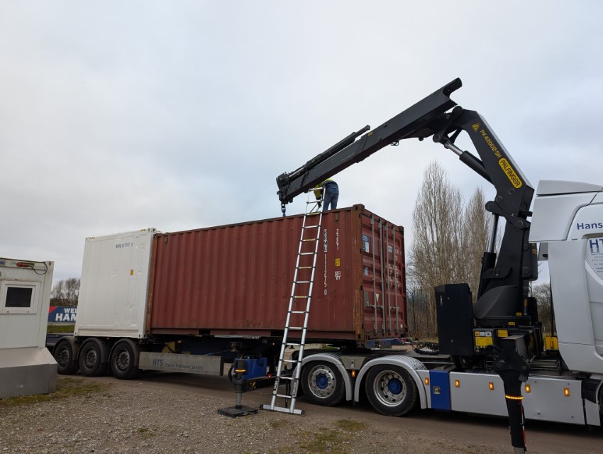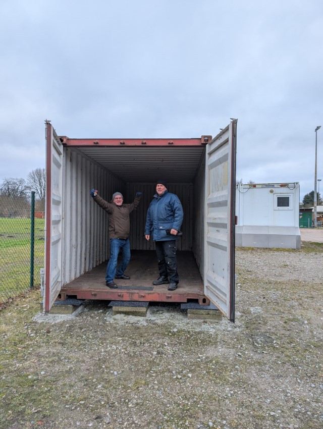 7.2.2025: Der Container wurde mit knapp einem Monat Verzögerung endlich geliefert. Uwe, Roberto, Gudrun und Kathrin Pietsch nahmen ihn in Empfang und meisterten einige Herausforderungen bei der Anlieferung. Der Container wurde schließlich mithilfe eines Krans auf die vorbereiteten Sockel gestellt.