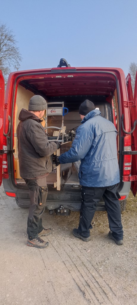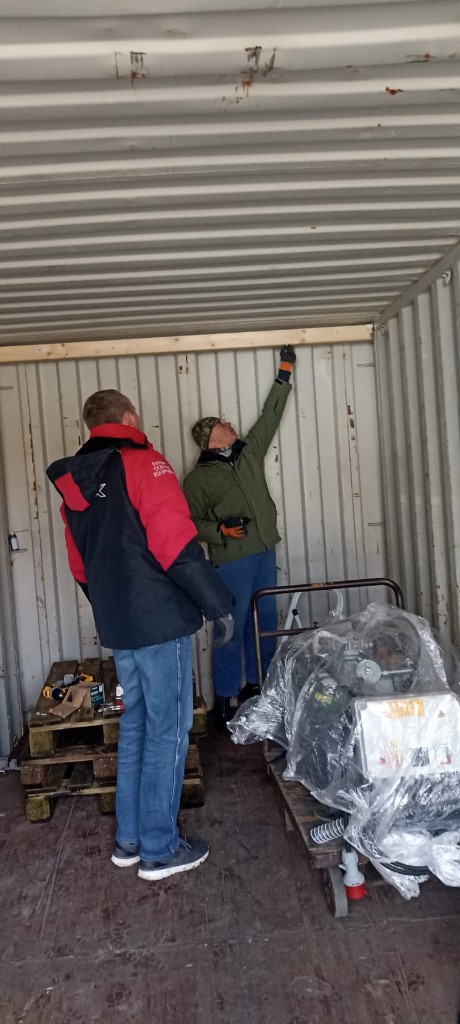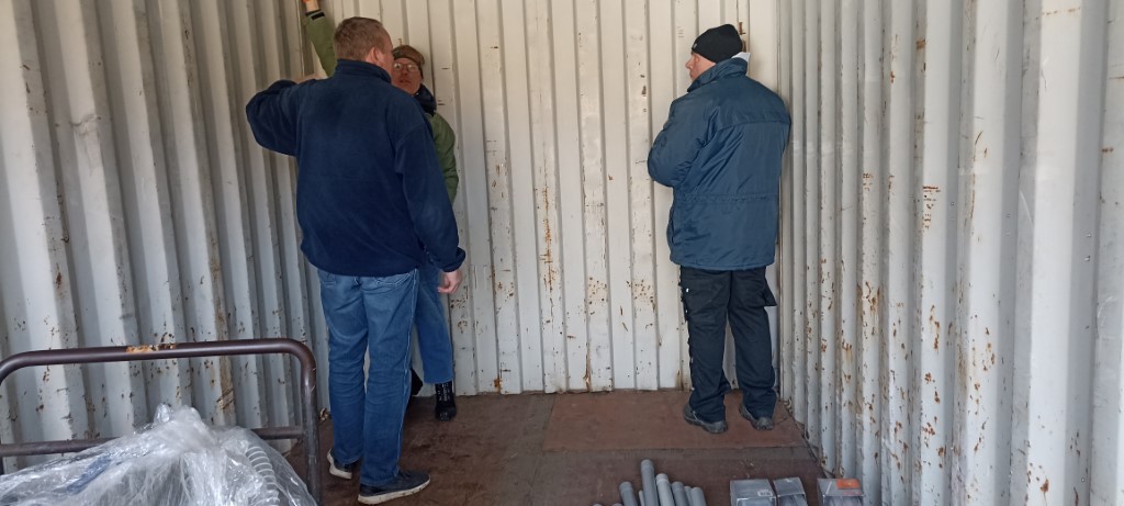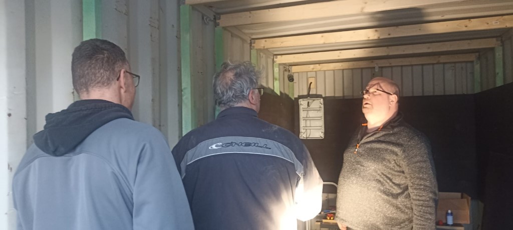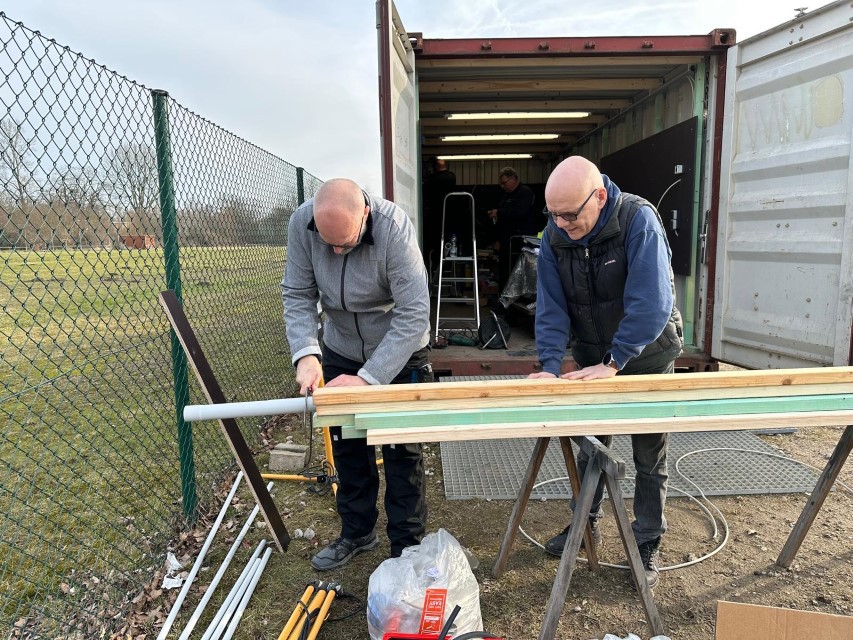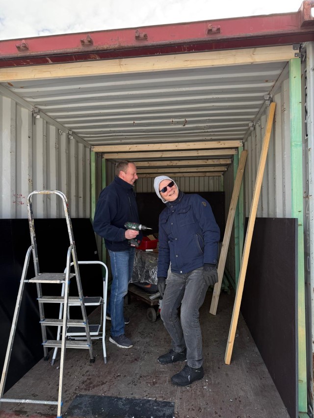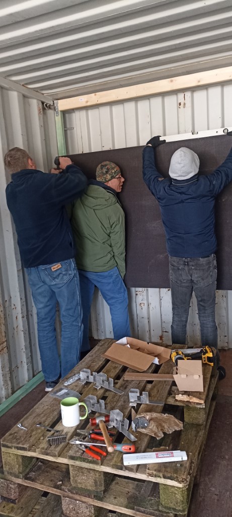8.2.2025: Der Innenausbau des Containers begann. Ingolf und Volker besorgten Materialien, während Kai den Kompressor anlieferte. Volker, Uwe, Ingolf und Henry bauten das Holzgestell, und Olaf installierte die Elektrik.