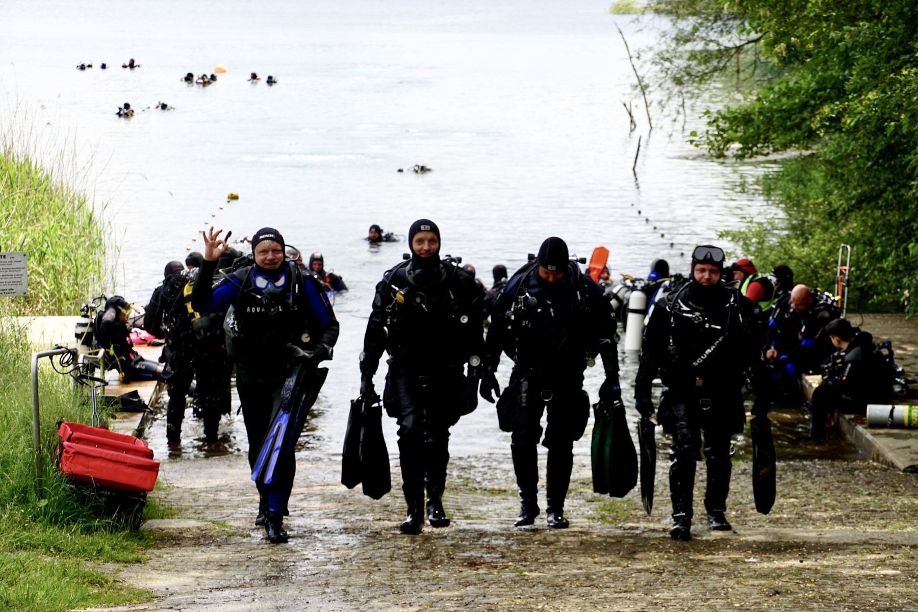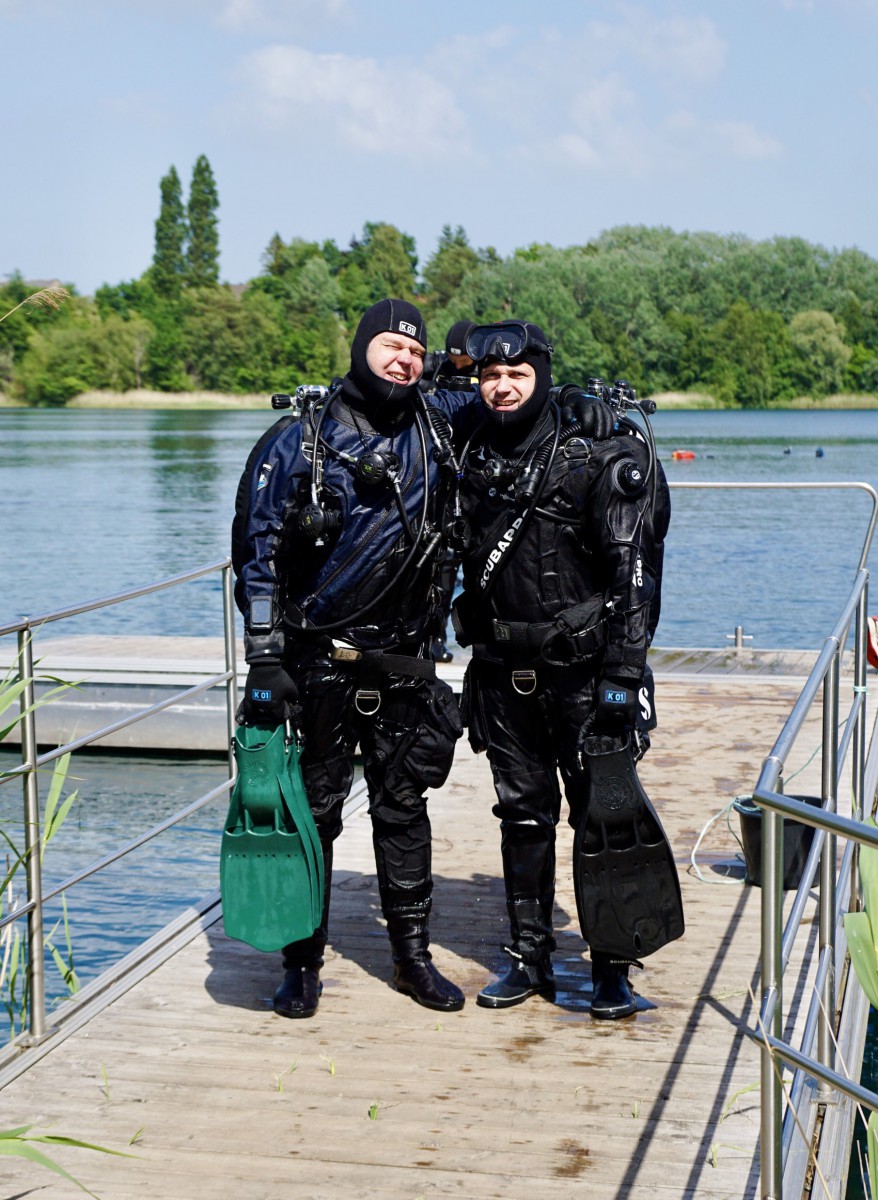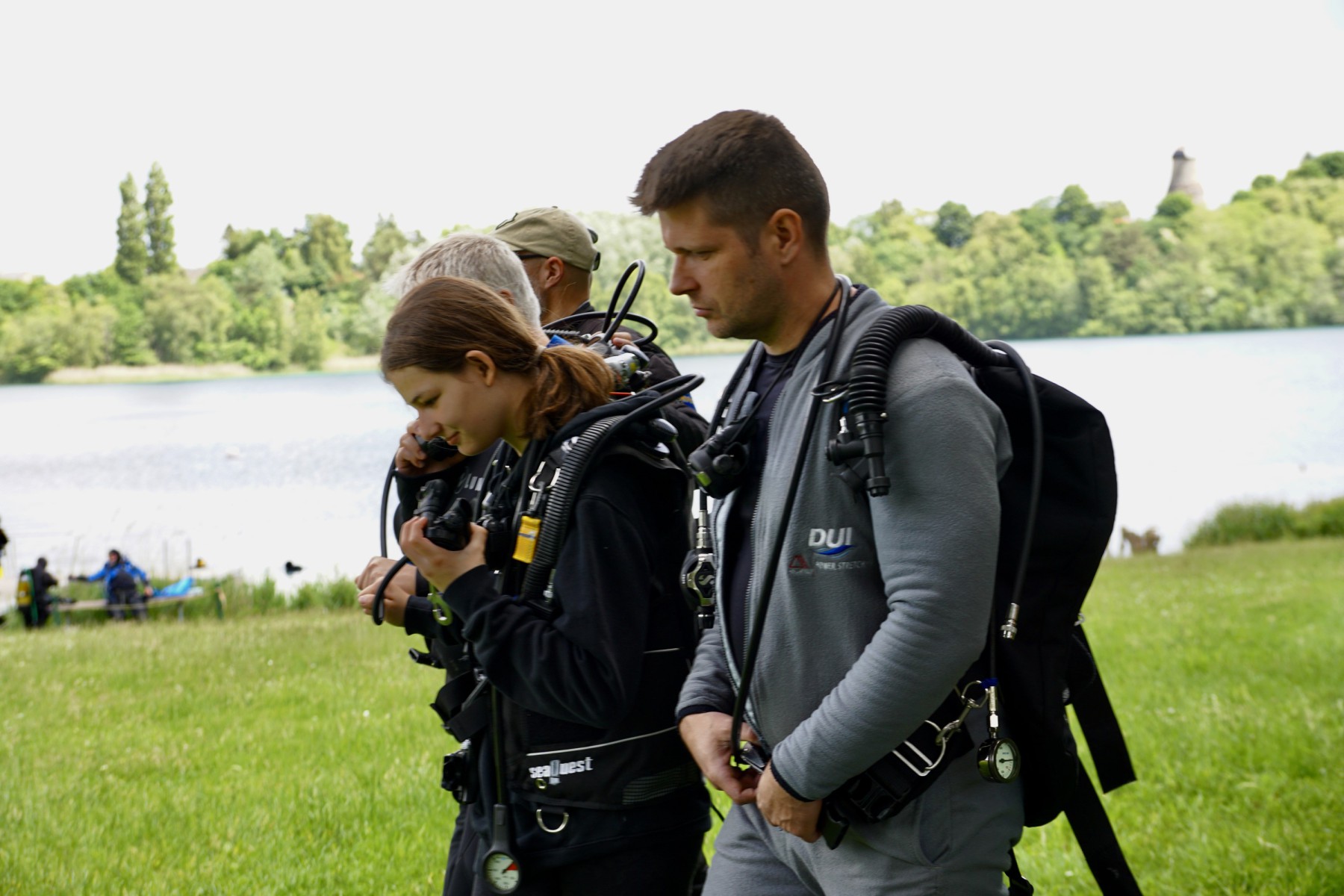 Ralph, Alexander und Viviana sollten mit Daniel die ersten Freiwassertauchgänge angehen. Dabei gab es kräftige Unterstützung von Simon und Martin. Insgesamt machten die drei 2 Tauchgänge und dabei einige der Bronzeübungen, wie die Maskenübung und Nachahmen der out of gas Situation. Die Übungen wurden beim Briefing mit den Dreien zunächst auf der Wiese durchgesprochen. Für die anderen aus dem TCV war es interessant dabei zuzusehen und wir stellten fest, dass auch die Erfahrenen Taucher diese Dinge immer wieder mal üben sollten.