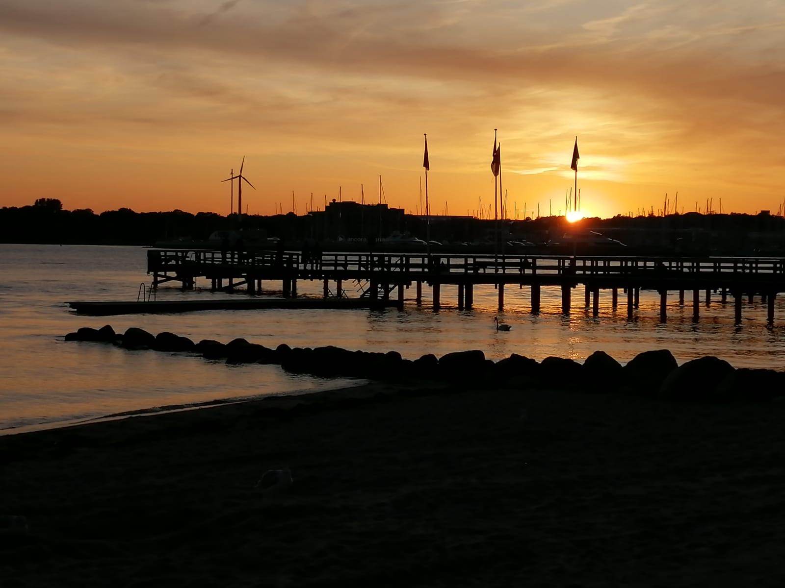 Die Bucht ist in die letzen roten Strahlen der untergehenden Sonne getaucht. Das Meer liegt spiegelgleich da, als wir hinein gehen. Schöner geht es nicht.
