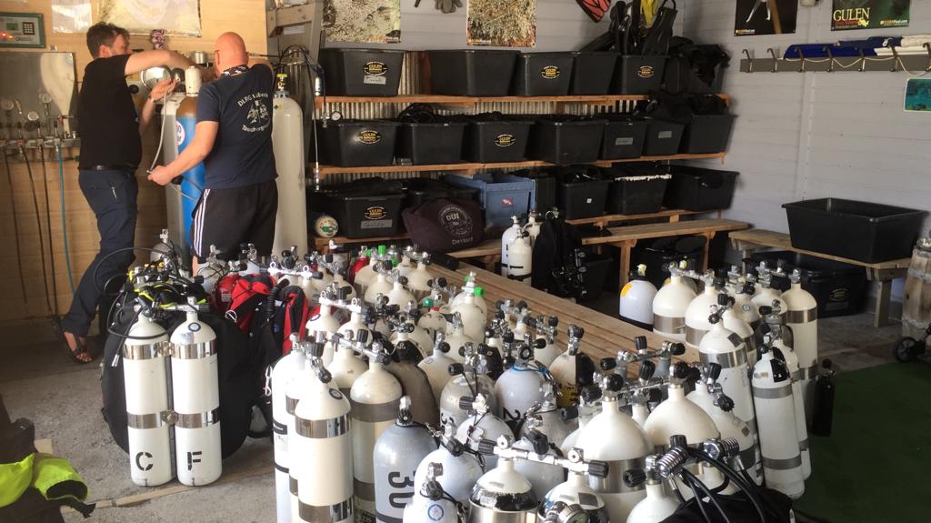 Der 2. TG des Tages geht an die Bandak, diese liegt deutlich flacher auf max. 29 m. Die Bandak ist zweimal gesunken, nach dem ersten Mal wurde sie gehoben und sogar verlängert. Der zweite Untergang ist dann aber endgültig. Ein schönes kleines Wrack (ca. 38m lang) um das Restgas des ersten TGs zu verschnüffeln. Nach einem kurzen TG von ca. 60 Min geht es Richtung Basis, wo wir um 16 Uhr wieder anlegen. Einige Gase, welche wir uns selbst mischen dank der aus Deutschland mitgebrachten 50L Industrieflaschen Helium und O2, sowie mitgebrachtem Überström-Equipment, müssen noch vorbereitet werden für den nächsten Tag. Da wir fast alle Gasblender in unserer Gruppe sind, hat die Basis nichts dagegen, im Gegenteil! Der Kompressor-Wart sitzt entspannt in der Sonne, lässt sich von uns eine Gerstenkaltschale servieren (funktioniert in Norwegern immer) und schaut zu was wir mit seiner Anlage machen. Anscheinend machen wir nichts falsch, es kommt zumindest kein Gemecker. Immer zwei von uns kümmern sich pro Abend um das Essen für alle, heute steht Grillen wegen des guten Wetters auf dem Plan, und nach dem Essen mit 2 TGs auf der Uhr und der langen Anreise fallen alle zeitig ins Koma.