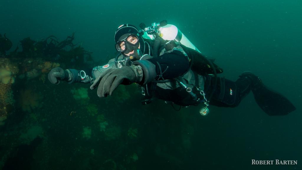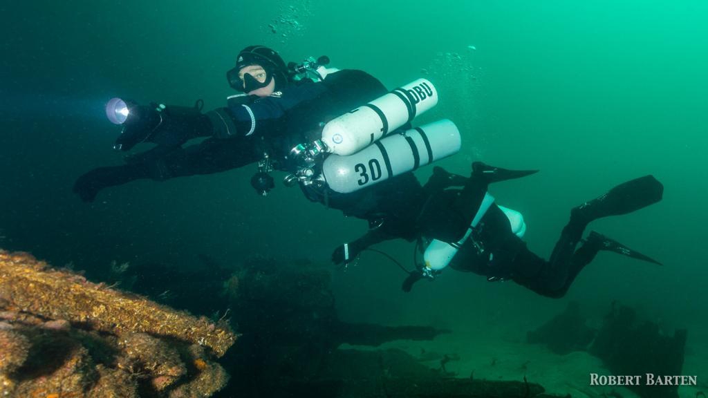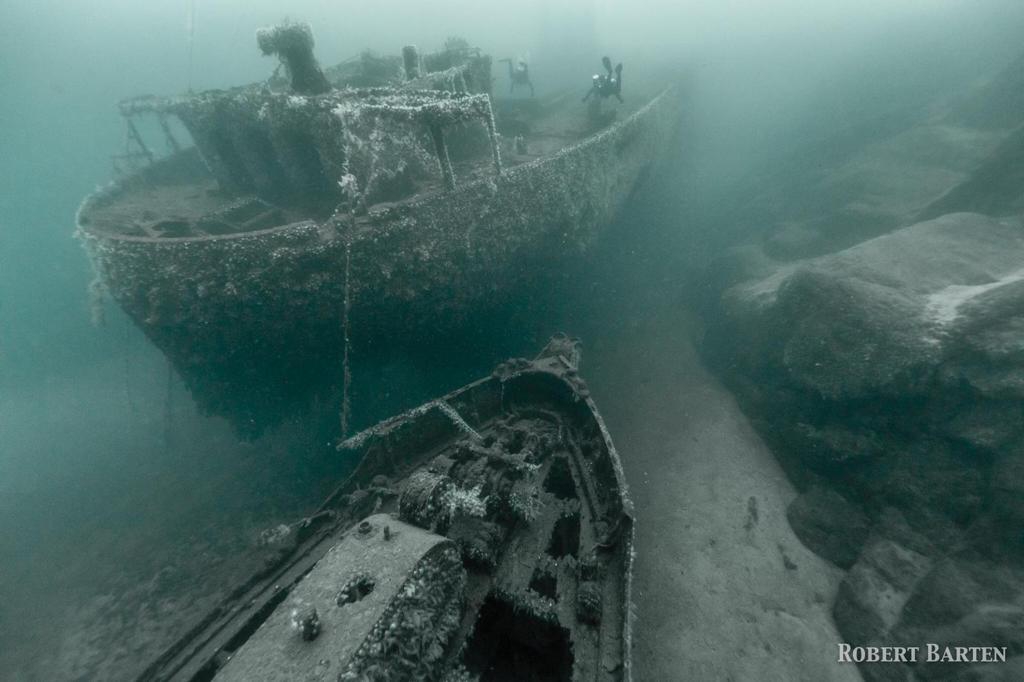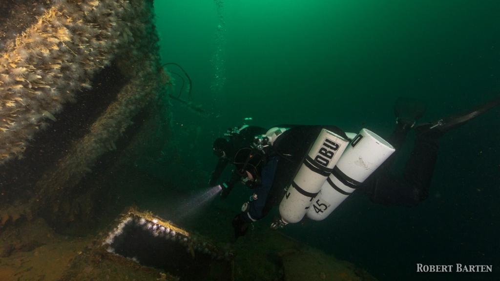 Tag 1: wir grooven uns ein mit einem TG am Doppelwrack „Ferndale + Parat“, kurz zur Historie: Ferndale (ein 116m Frachter) läuft nachts auf einen Felsen und wird daher am nächsten Morgen sofort von englischen Fliegern entdeckt, die in den letzten Kriegstagen in Norwegen die Lufthoheit haben. Sie greifen an und werfen Bomben. Ferndale wird stark beschädigt. Die Parat eilt zur Hilfe mit einem Reparatur-Team und sogar Tauchern an Bord und wird ebenfalls angegriffen. Nach einigen Stunden sinkt zunächst Parat und kurz darauf auch Ferndale, diese trifft nur 2m entfernt von der bereits gesunkenen Parat auf den Grund. Wir erkunden beide Wracks, Parat liegt auf Max. 60 m, darüber türmt sich das Heck der Ferndale auf, ein imposanter Anblick, der Bug endet bei 10m. An der dortigen Boje beenden wir unsere Deko und haben so die ganze Zeit viel zu sehen an beiden Wracks. Besser als eine freie Deko irgendwo in der Wassersäule!