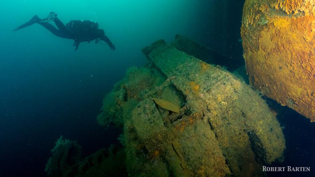 Tag 2: Aufgrund des guten Wetters nehmen wir 2 Fahrtstunden mit dem Boot in Kauf und steuern die Position der Welheim an, ein 145m Frachter auf Tiefen zwischen 15 – 70m. Nach 35 Min am Wrack mit einer Max. Tiefe von 55m und einer durchschnittlichen Tiefe von über 40m am Ende der Grundzeit, folgt die Dekozeit von ca. 30min zwischen 21 und 6m mit EAN50. Es strömt leicht, die Leine der Wrackboje flattert etwas aber mit leichtem Frogkick kann man sich locker an der Leine halten. Obwohl mein Inflator beim Pre-Dive-Check unkontrolliert mein Wing befüllt hat, ein entspannter TG. Das Wing kann man ja auch mit dem Mund befüllen, wer braucht schon einen noch dazu kaputten Inflator Wir schauen uns ausgiebig die riesige Super-Struktur der Brücke an, welche das Wrack dominiert, dazu riesige Ladekräne, Winden, man findet sogar noch Sicherheitsglas an einigen Stellen. Das Wrack liegt 85grad gekippt auf seiner Backbordseite. Die Welheim war zu Ihrer Zeit ein sehr modern ausgestattetes Schiff, gebaut übrigens in …. Hamburg.