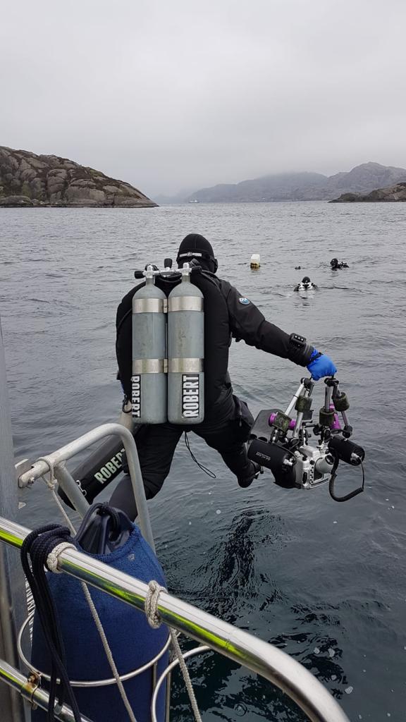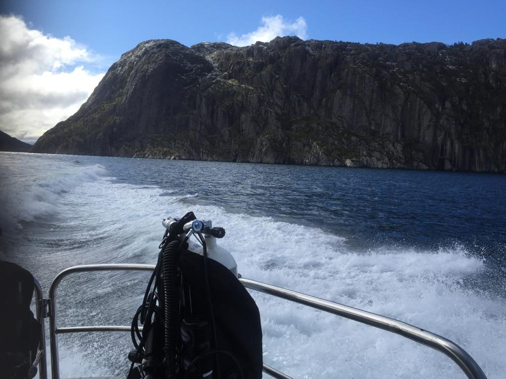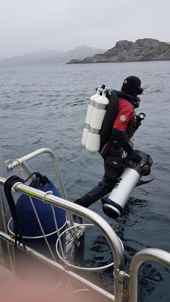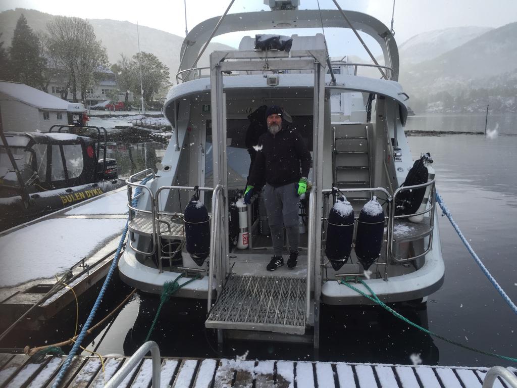 Am 27.04.19 ging es dann los mit einer rollenden Gasbombe, Klamotten und meinem Anteil an der Verpflegung für eine Woche mit 9 Tauchern, 8 Männern und einer Frau. Nach meiner wirtschaftlichsten Fahrt ever mit meinem Wagen trotz max. Zuladung (4,6l/100km) aufgrund der Beschränkung in Dänemark erreiche ich um 18 Uhr abends mein erstes Zwischenziel: Hirtshals, im hohen Norden Dänemarks. Um 20 Uhr legte die Fähre, die uns nach Bergen bringen sollte, pünktlich ab. Kabine für eine Nacht beziehen mit 2 anderen der Gruppe und dann trafen sich alle zum Beschnuppern und zum Buffet im Bordrestaurant. Schnell stelle ich fest: alles richtig gemacht, das hier ist eine super Truppe, mit der man durchaus nochmal losziehen könnte. Irgendwann geht es dann in die Koje und nach einem ausgiebigen Frühstück legt die Fähre um ca. 12 Uhr mittags am nächsten Tag in Bergen an. Nach weiteren 2,5 Std. Autofahrt ist das Ziel erreicht: Gulen, im größten Fjord Norwegens gelegen, dem Sognefjord. Zimmer in der Basis beziehen, Auto ausladen, Küche mit Verpflegung füllen und dann ab ans Hausriff zum ersten „Checkdive“. Passt die Bleimenge, läuft der Scooter, funzt die Lampe, kann ich noch im Meer tauchen oder doch lieber zukünftig nur noch Training an der Plattform in Hemmoor? Schon etwas her die letzte Wracktour aber Gott sei Dank noch nicht verlernt .