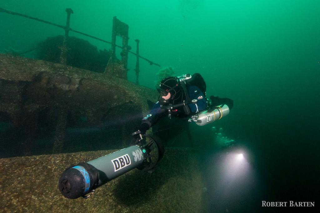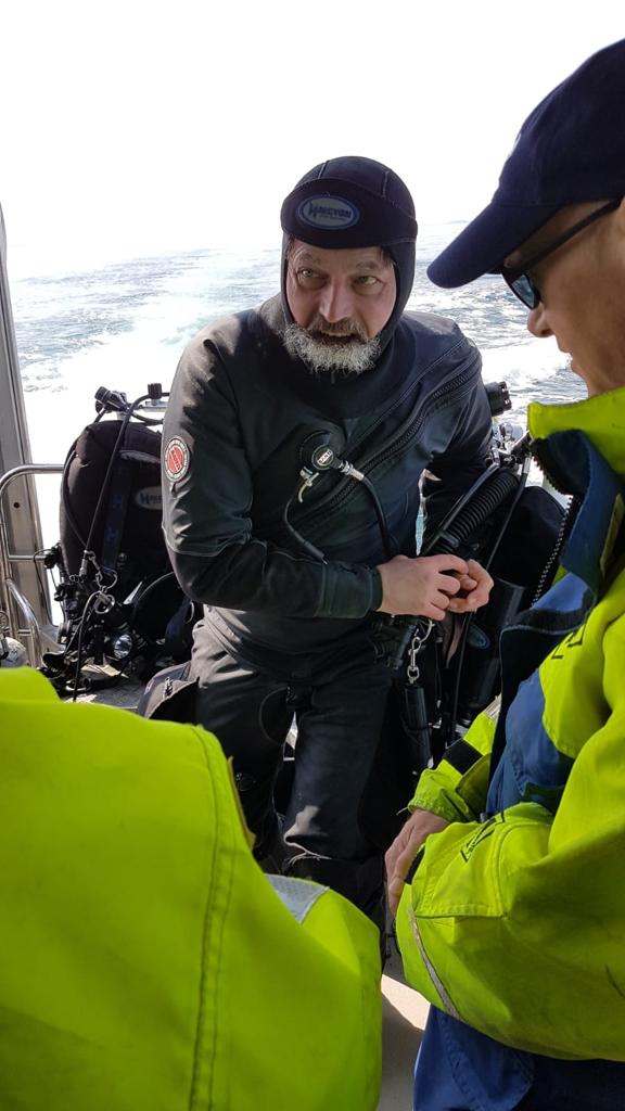 Tag 3: Endlich, heute steht die Frankenwald für 2 TGs auf dem Programm, das schönste Wrack Norwegens gem. Taucher-Wahl 2018, noch dazu sind beide TGs als Scooter-TGs geplant. Ein ambitionierter Unterwasser-Photograph (Robert) mit einer state-of-the-art Kamera-Ausrüstung aus unserer Gruppe braucht Scooter-Taucher als Models vor der beeindruckenden Frankenwald als Hintergrund, soweit das Programm für diese Tauchgänge. In einem Wort: Rock‘n Roll!!!