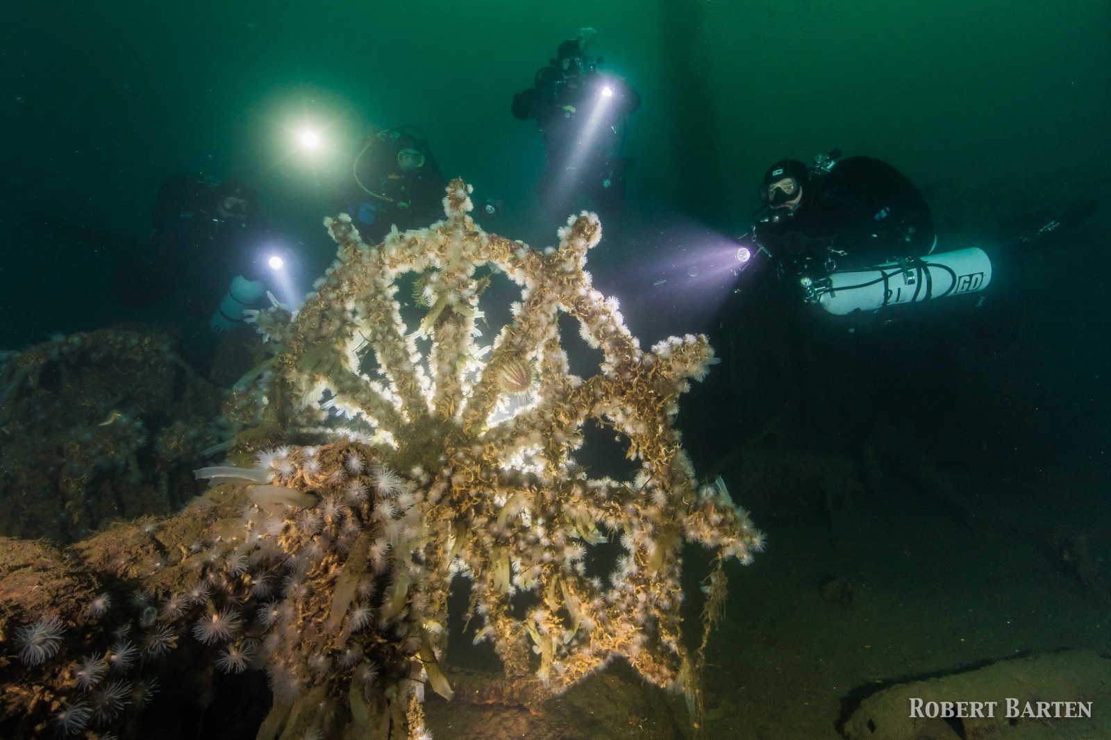Die Scooter sind eine gute Idee, das Wrack ist lang mit 136m Länge und liegt zwischen 25 – 44 m Tiefe. Ideal zum Scootern über die gesamte Länge! Ziemlich genau Mitschiffs an Backbord zeigt sich ein großer vertikaler Riss, verursacht durch eine Stauchung beim Aufschlag auf dem Meeresgrund. Wieder riesige Frachträume, die Brücke ist zwischenzeitlich kollabiert und liegt als dreieckig in sich zusammengesunkene Struktur da. Das Vorschiff ist ebenfalls sehr fragil, die Wände sind an einigen Stellen vielleicht noch 3mm stark, ein Mal mit der Faust dagegen geboxt und ich bin durch! Hier rein zu tauchen könnte keine gute Idee sein! Zwei riesige Masten stehen noch fast unbeschädigt, wobei sich der eine schon etwas neigt, und ragen bis ca. 20m unter die Wasseroberfläche auf. Das Wrack liegt aufrecht und wie geparkt auf dem Grund. Überall Nacktschnecken, Seesterne, Seehasen, Dorsch, Pollack, Leng, Hering usw.! Schön kalt ist es auch, Dank mitgebrachter Heizweste aber kein Problem. Nach 90 min Oberflächenpause nehmen wir unsere 30m-Stage und schauen uns beim zweiten TG die flacheren Aufbauten an. Tiefenlimit etwas über 30m, aber das reicht auch. Als meine Stage leer ist, sind wir auf 21m und ich verschnüffel den Rest des Dekogases vom ersten TG. Nach 55 min ist dann aber auch der 2. TG an der Frankenwald zu Ende, aber wir haben unsere Gesamttauchzeit am Wrack optimal genutzt. Der Photograph hat spektakuläre Bilder im Kasten und würde im Kreis grinsen, wenn die Ohren nicht wären. Alle sind wieder an Bord und schnattern, man merkt, dass das Wrack alle beeindruckt hat. Der Wahl zum schönsten Wrack Norwegens kann ich mich vermutlich anschließen, obwohl Norwegen sicher noch einige Wracks zu bieten hat. Abends in der Basis sind mein Buddy Gerald und ich für das Essen zuständig, wir machen Pizza im Schichtbetrieb, es schmeckt super, vor allem der von Gerald selbstgemachte Teig! Erste Photos und Videos werden begutachtet. Eins der Bilder kommt auf jeden Fall ins Wohnzimmer, da muss Anke durch.