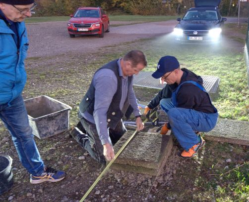 Statt eines Early Dive machten am 25.10.24 um 7 Uhr morgens Henry, sein Freund Thorsten, der Polier ist, Uwe, Dieter und unserer Fotograf Ralf Wedler einen Early Drive zur Baustelle unseres neuen Vereinsheims. Heute stand das Gießen des Zementbettes, das zur Aufstellung des Containers notwendig ist, auf der ToDo-Liste. Zuvor hatten Uwe und Dieter das Gebiet so exakt vermessen, dass Thorsten es komplett bestätigen und so die Eckpunkte festlegen konnte. Dazu mussten allerdings Uwe, Dieter und Henry heute ein 60 x 60 cm Fläche ausheben, um die Platten gut verlegen zu können. Das war harte Arbeit, denn der Boden war dank des guten Wetters zwar nicht gefroren, aber sehr, sehr hart. Nach getaner Tat konnte der Zement gegossen werden und der Platz ist ab jetzt für die Containeraufstellung vorbereitet. Und damit wir alle an den Aktivitäten teilhaben können machte Ralf die Fotos, um den Fortschritt zu dokumentieren.